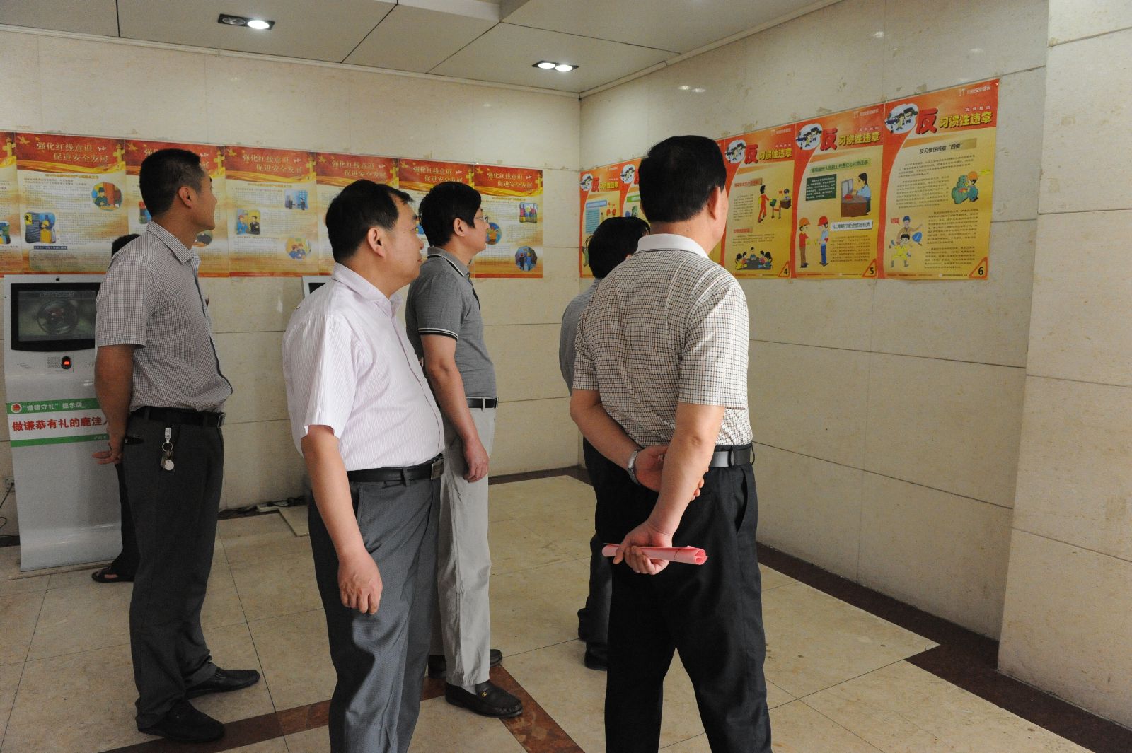 随后,在采掘办公楼前,副总工程师以上领导、机关科室人员及生产区队干部职工代表400余人,在写有"强化红线意识,促进安全发展"的条幅上签上自己的名字,保证安全生产。接着,矿领导班子成员同干部职工一同到采掘楼大厅观看了安全月宣教图片展览。